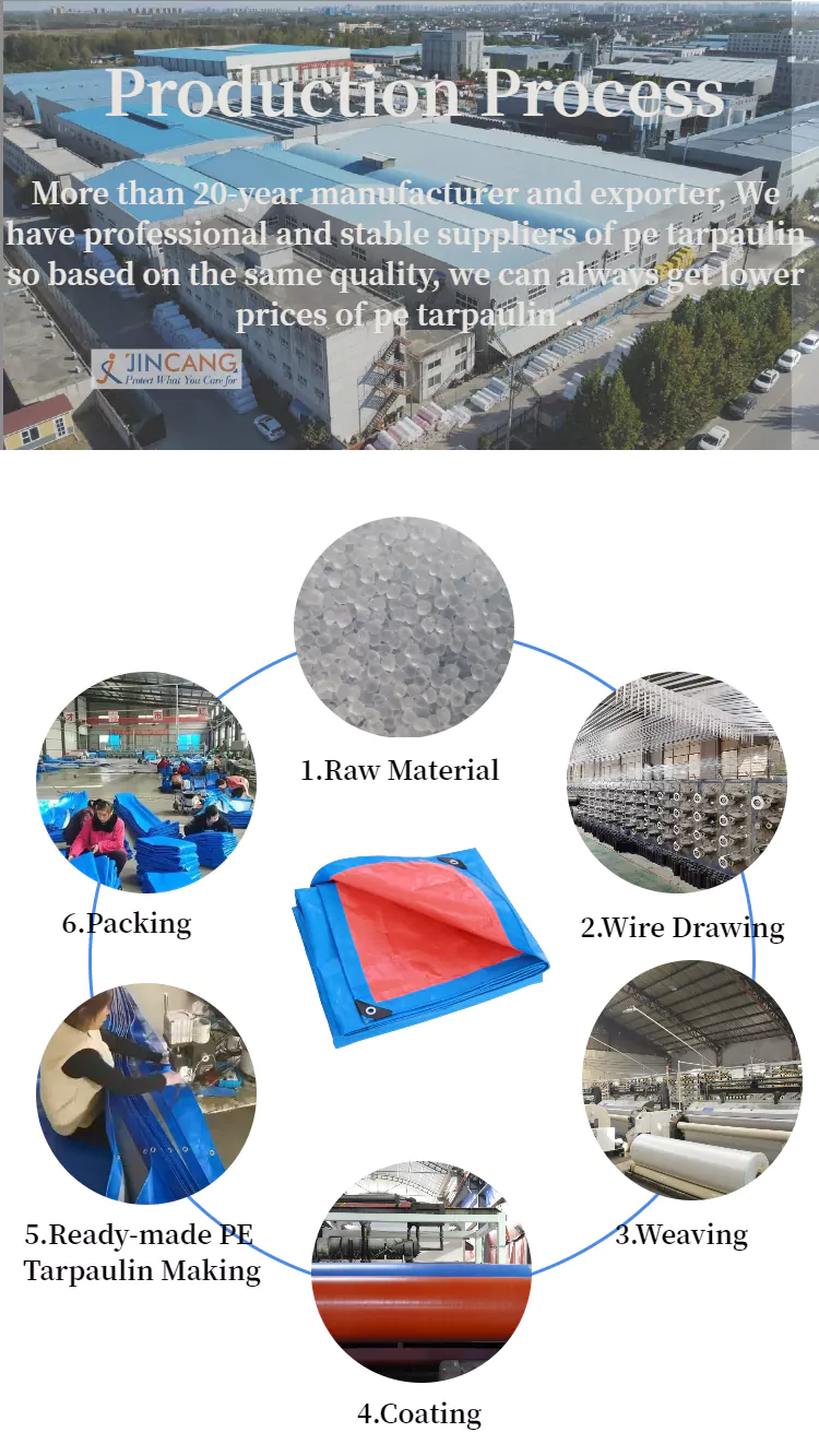 Jincang یکی از تولید کنندگان حرفه ای رول برزنت پلی اتیلن در چین است، رول برزنت PE نوار 90 GSM بسته به رول است. عرض معمولاً 1.83 متر، 2 متر، 4 متر، 5 متر، 6 متر است. طول معمولاً 63 متر، 91، 100 متر و 200 متر و غیره است. و ما همچنین می توانیم طبق نیاز شما سفارشی کنیم. به طور گسترده ای برای محافظت در فضای باز، پوشش کالاها، سایت های ساخت و ساز، اهداف کشاورزی و پناهگاه های موقت استفاده می شود.
